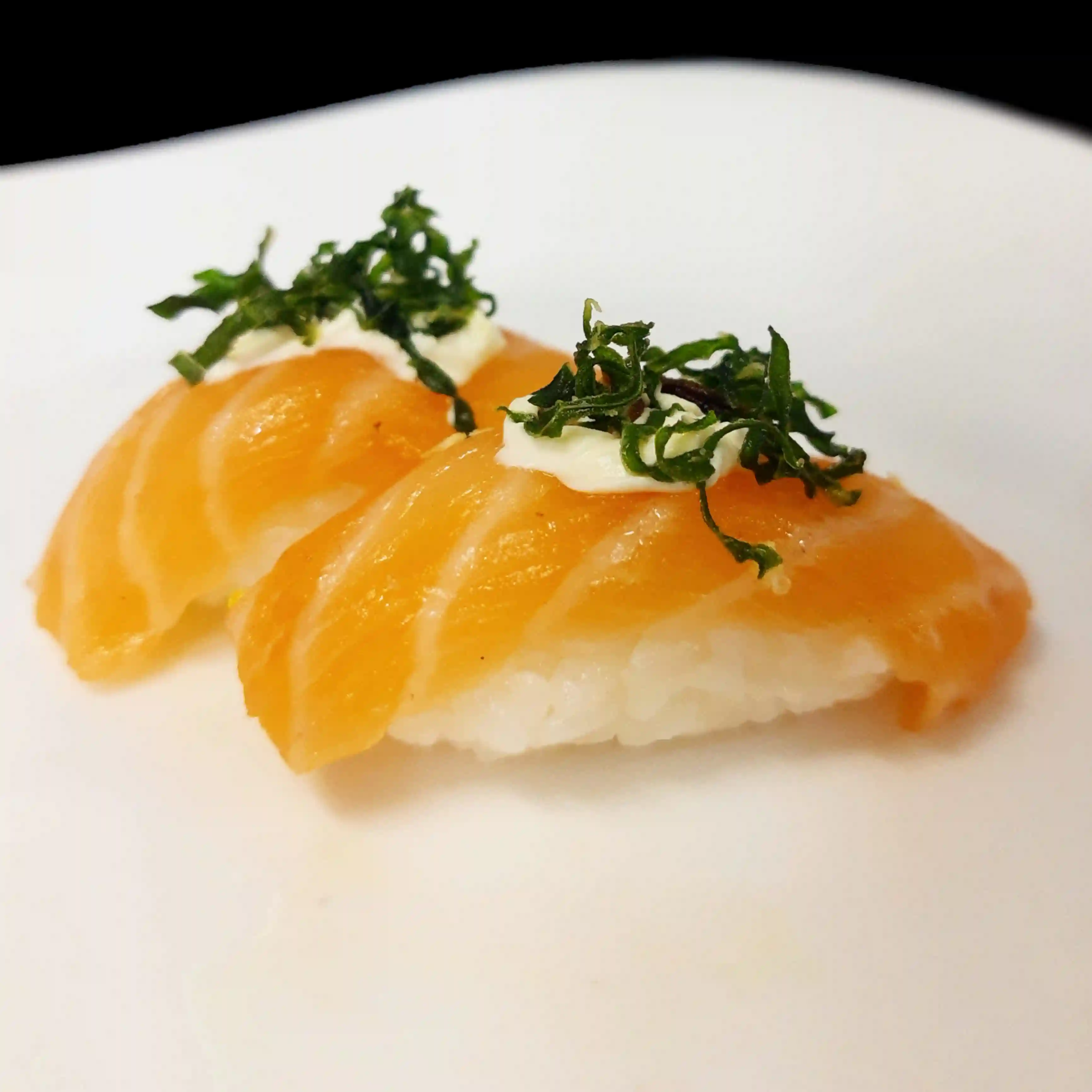 Niguiri Salmão C/Amêndoas Laminadas e Azeite trufado. Ingredientes: Arroz de Sushi, Salmão, Cream Chesse, Amêndoas laminadas e Azeite Trufado.